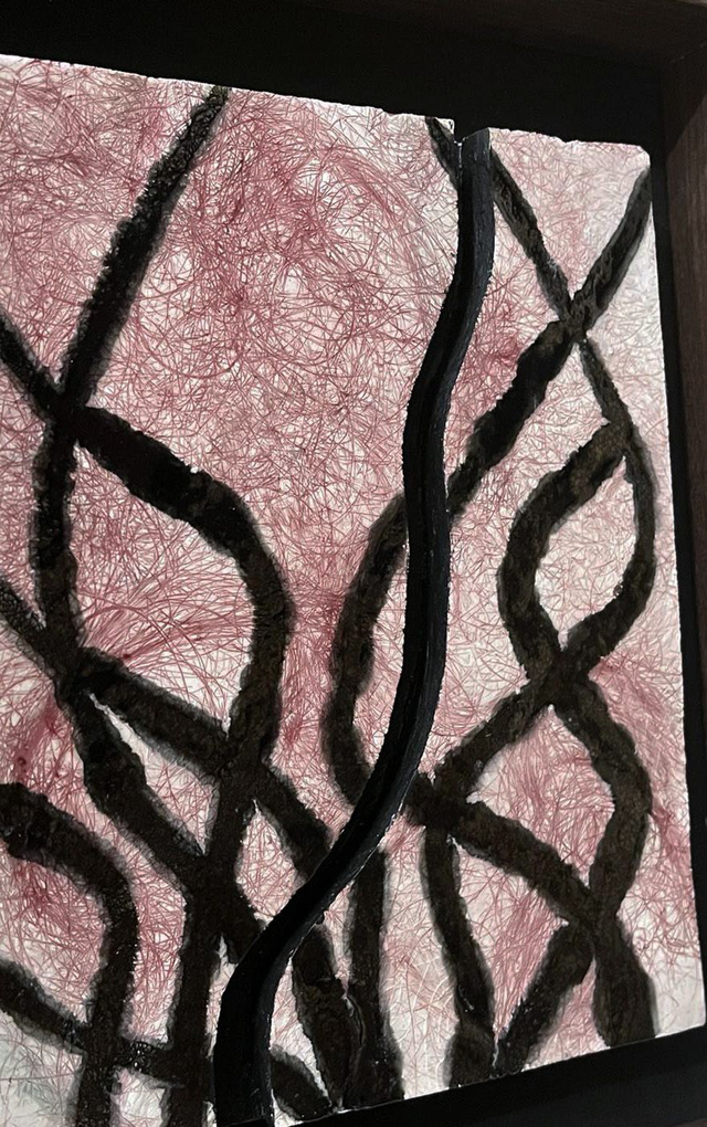 Une empreinte délicate se révèle sur la surface de céramique émaillée, comme le souvenir d'un souffle passé. L'oxyde rose vient habiller ces traces d'une douceur vibrante, tandis qu'un émail noir dessine un récit graphique à la fois subtil et affirmé. À travers cette composition, un brise organique semble danser, léger, indomptée, et pourtant empreinte de profondeur.